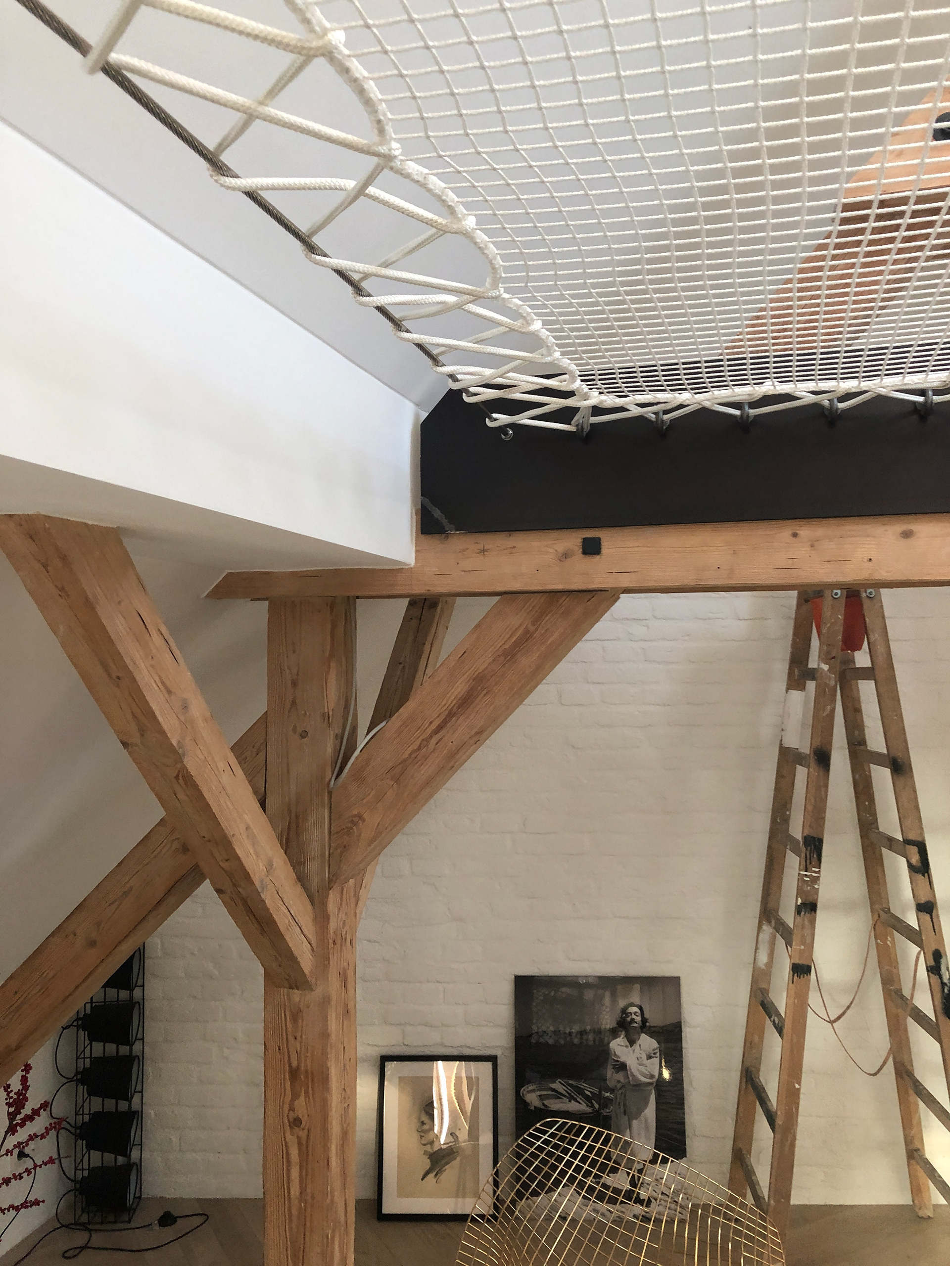 Der Kontrast aus Dunklen und Hellen Oberflächen wird durch die warmen Holztöne des Sichtdachstuhls komplimentiert.
